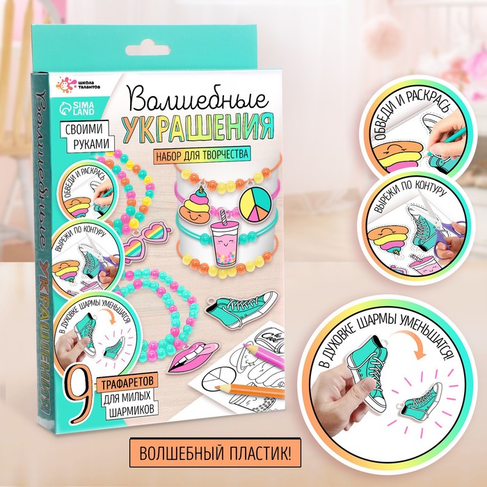 Создавать украшения своими руками стало ещё интереснее. Ведь помимо бусинок можно добавить шармы, сделанные своими руками. Для этого возьмите лист с трафаретами и наложите сверху лист волшебного пластика. Затем аккуратно обведите и раскрасьте картинки, вырежьте рисунки по контуру и запеките в духовке. После нагревания картинки уменьшаться в несколько раз. Теперь можно собирать яркие оригинальные украшения.