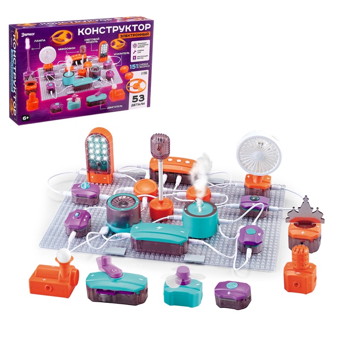 - 53 элемента для сборки: В комплекте набор компонентов, из которых можно создать рабочие схемы, включая генераторы, датчики и простые логические устройства.