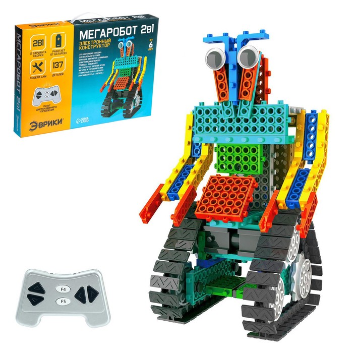 Конструктор ТМ «Эврики» двигается с помощью электромеханического привода. В инструкции ребёнок найдёт 2 варианта сборки или придумает свои.