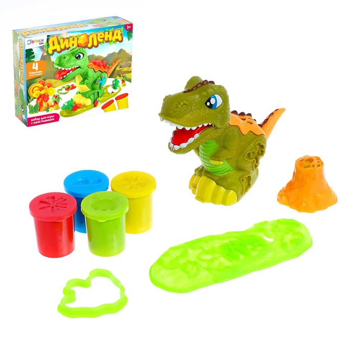 В наборе идёт 4 баночки пластилина, формочки и фигура динозавра. Пластилин не липнет к рукам, его можно убирать в ёмкости и доставать много раз.