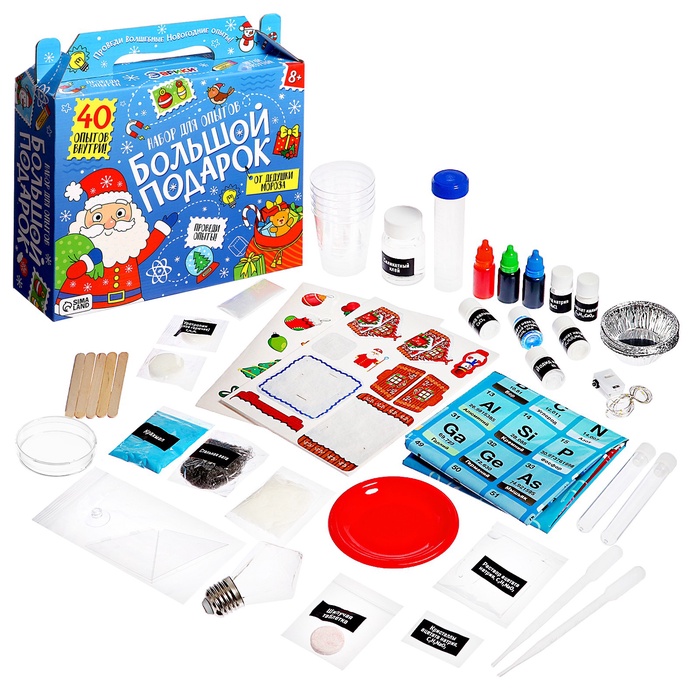 С набором для опытов «Большой новогодний подарок» — то, что нужно для полезного и интересного досуга! Такой подарок поможет ребёнку скрасить ожидание Нового года, а также позволит провести целых 40 увлекательных опытов!