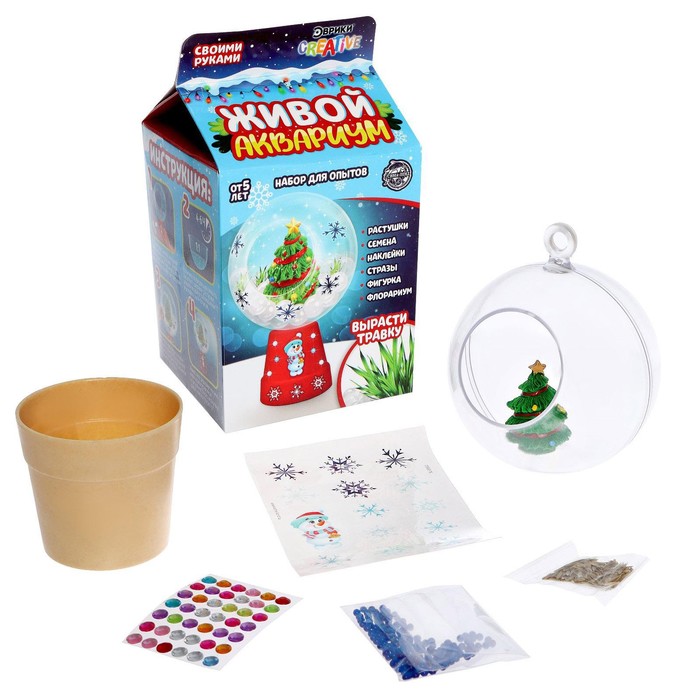 С помощью этого набора ребёнок создаст собственный новогодний мини-сад. Юный исследователь соберёт композицию, украсит её, вырастит гидрогелевые шарики и посадит настоящую траву.