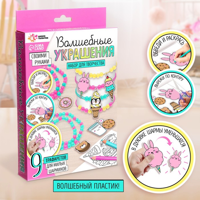 Создавать украшения своими руками стало ещё интереснее. Ведь помимо бусинок можно добавить шармы, сделанные своими руками. Для этого возьмите лист с трафаретами и наложите сверху лист волшебного пластика. Затем аккуратно обведите и раскрасьте картинки, вырежьте рисунки по контуру и запеките в духовке. После нагревания картинки уменьшаться в несколько раз. Теперь можно собирать яркие оригинальные украшения.