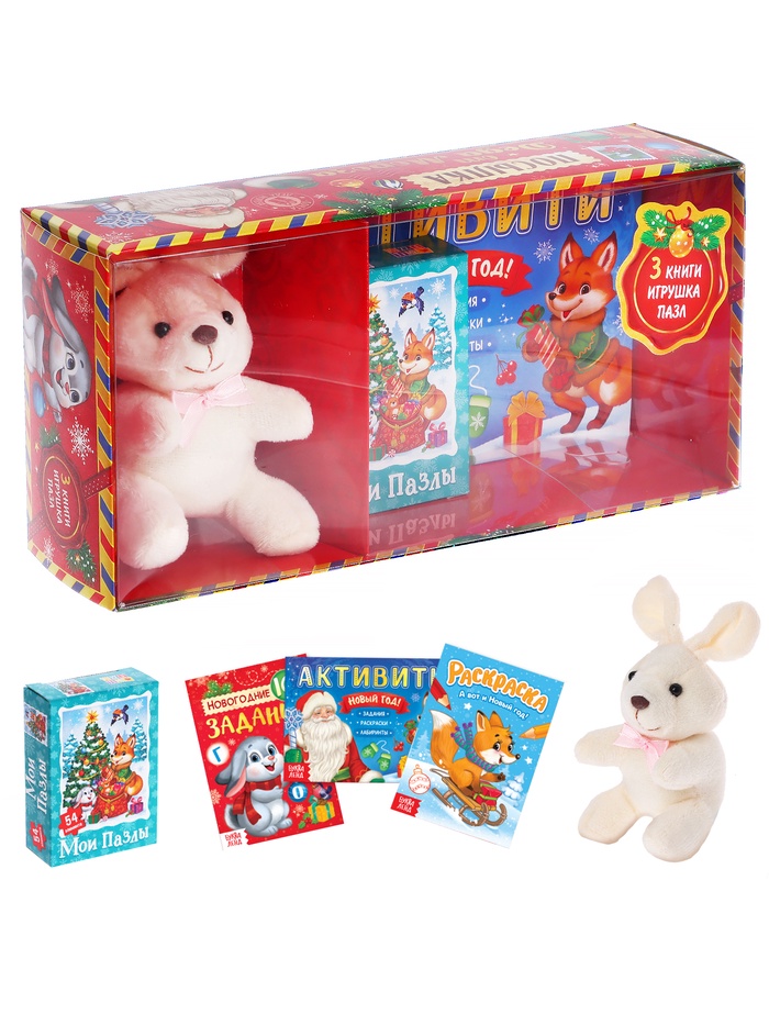 Подарочный набор с тремя книгами, игрушкой и пазлами станет эффектным презентом для малыша. Такой набор подойдёт для индивидуального поздравления дома и для подарков от Деда Мороза в детском саду.