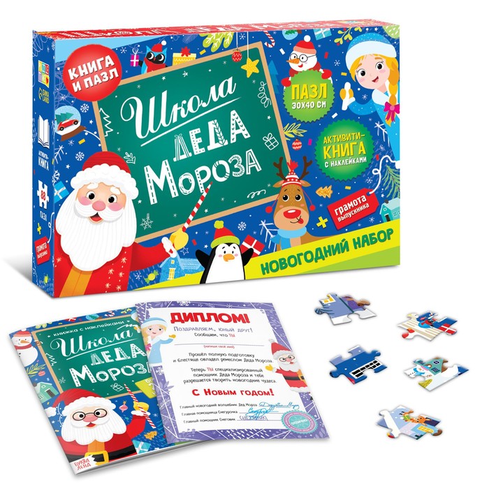 - Внутри вы найдёте книгу с наклейками, пазл и диплом выпускника школы Деда Мороза.